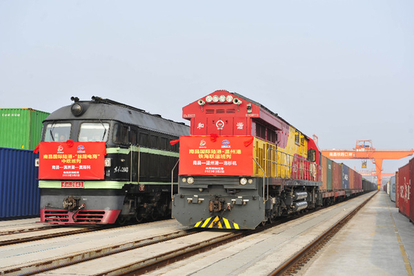 3月2日,“南昌-满洲里-莫斯科”中欧班列(左)、“南昌-温州港-洛杉矶”铁海联运班列准备从南昌国际陆港铁路口岸二期驶出。